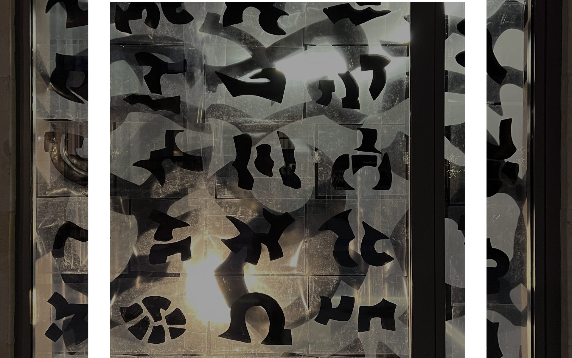 Auf einer ersten Ebene werden transparente Folien mit skriptural-grafischen, undurchsichtigen und schwarzen Elementen auf der Schaufensterfront angebracht. Auf einer zweiten Ebene werden Folien mit weiteren skripturalen Formationen im Ausstellungsraum platziert. Dadurch entsteht durch diverse räumliche Durchdringungen und Transparenzen eine spannende Überlagerung, die durch eine Lichtinstallation noch verstärkt wird und im öffentlichen Aussenraum leuchtend zum Entdecken einlädt.
